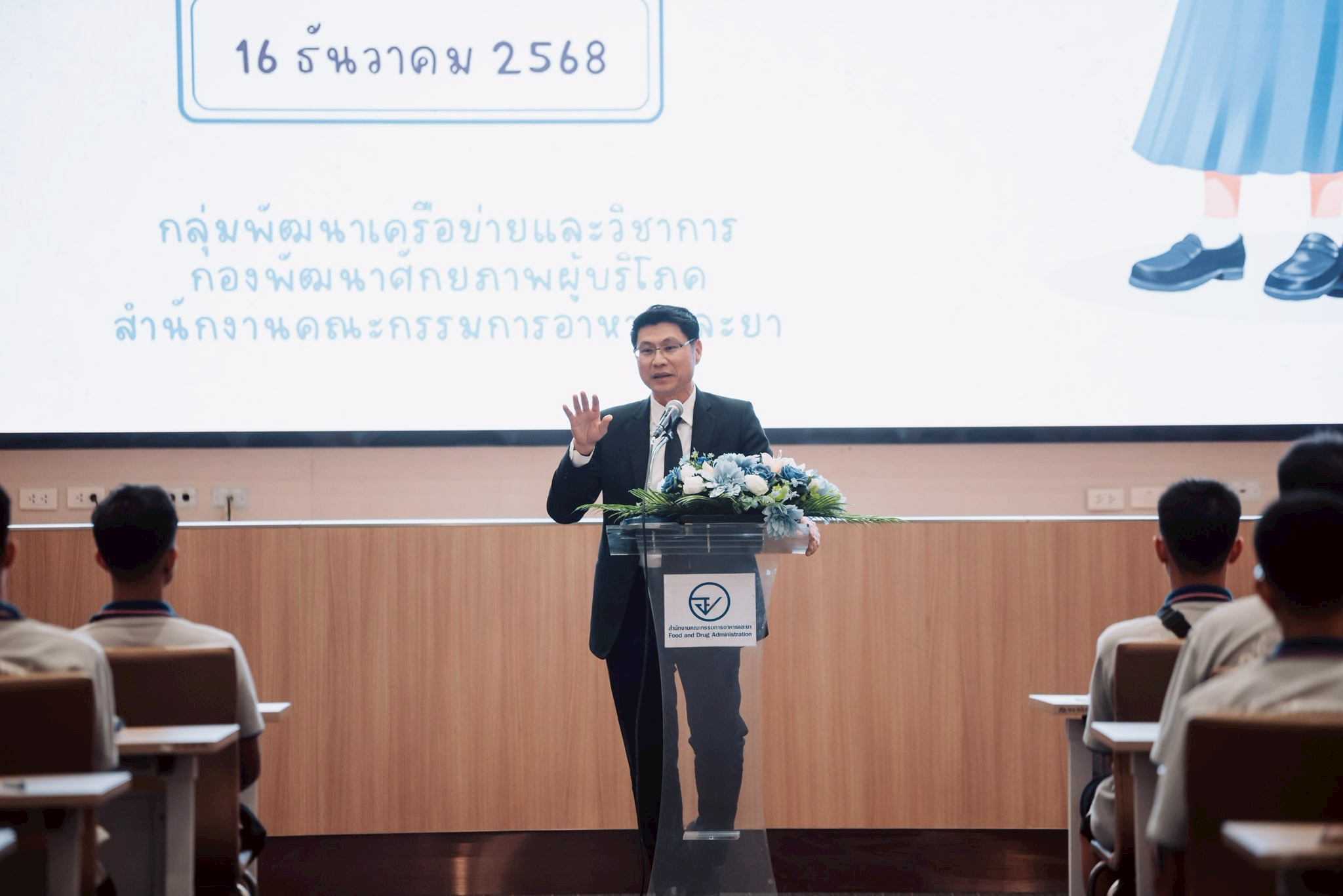 วันนี้ (16 ธันวาคม 2568) ณ ห้องประชุมชั้น 10 อาคารศูนย์บริการผลิตภัณฑ์สุขภาพเบ็ดเสร็จ สำนักงานคณะกรรมการอาหารและยา เภสัชกรเลิศชาย เลิศวุฒิ รองเลขาธิการคณะกรรมการอาหารและยา ให้เกียรติเป็นประธานมอบโอวาทและกล่าวต้อนรับนักเรียน “อย.น้อย” โรงเรียนสตรีวิทยา 2 ในพระราชูปถัมภ์ฯ เข้าศึกษาเรียนรู้กระบวนการทำงานของ อย. ผ่านเส้นทางการเยี่ยมชม (FDA Learning Journey) เพื่อเสริมสร้างความเข้าใจด้านการคุ้มครองผู้บริโภคและการใช้ผลิตภัณฑ์สุขภาพอย่างปลอดภัย