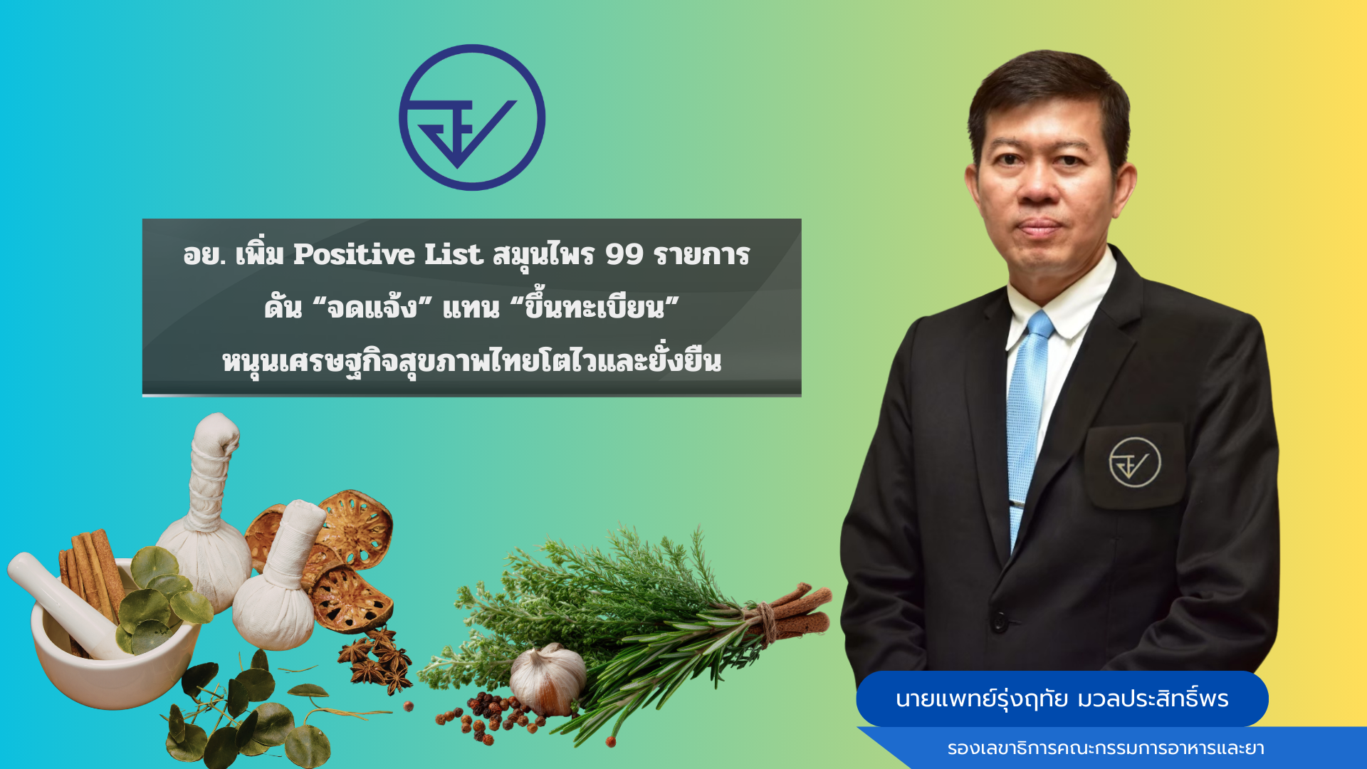 อย. เดินหน้ายกระดับอุตสาหกรรมสมุนไพรไทย ประกาศเพิ่มรายการผลิตภัณฑ์มาตรฐาน หรือ “Positive List” อีก 99 รายการ ครอบคลุมทั้งยาแผนไทย ผลิตภัณฑ์เสริมสุขภาพ และเวชสำอาง เปลี่ยนรูปแบบจากการขึ้นทะเบียนตำรับ มาเป็นการ “จดแจ้ง” ช่วยลดขั้นตอนและเวลาการนำสินค้าเข้าสู่ตลาด ลดต้นทุนและข้อจำกัดด้านการวิจัย โดยเฉพาะผู้ประกอบการรายย่อยสามารถเข้าถึงนวัตกรรมได้ง่ายขึ้น