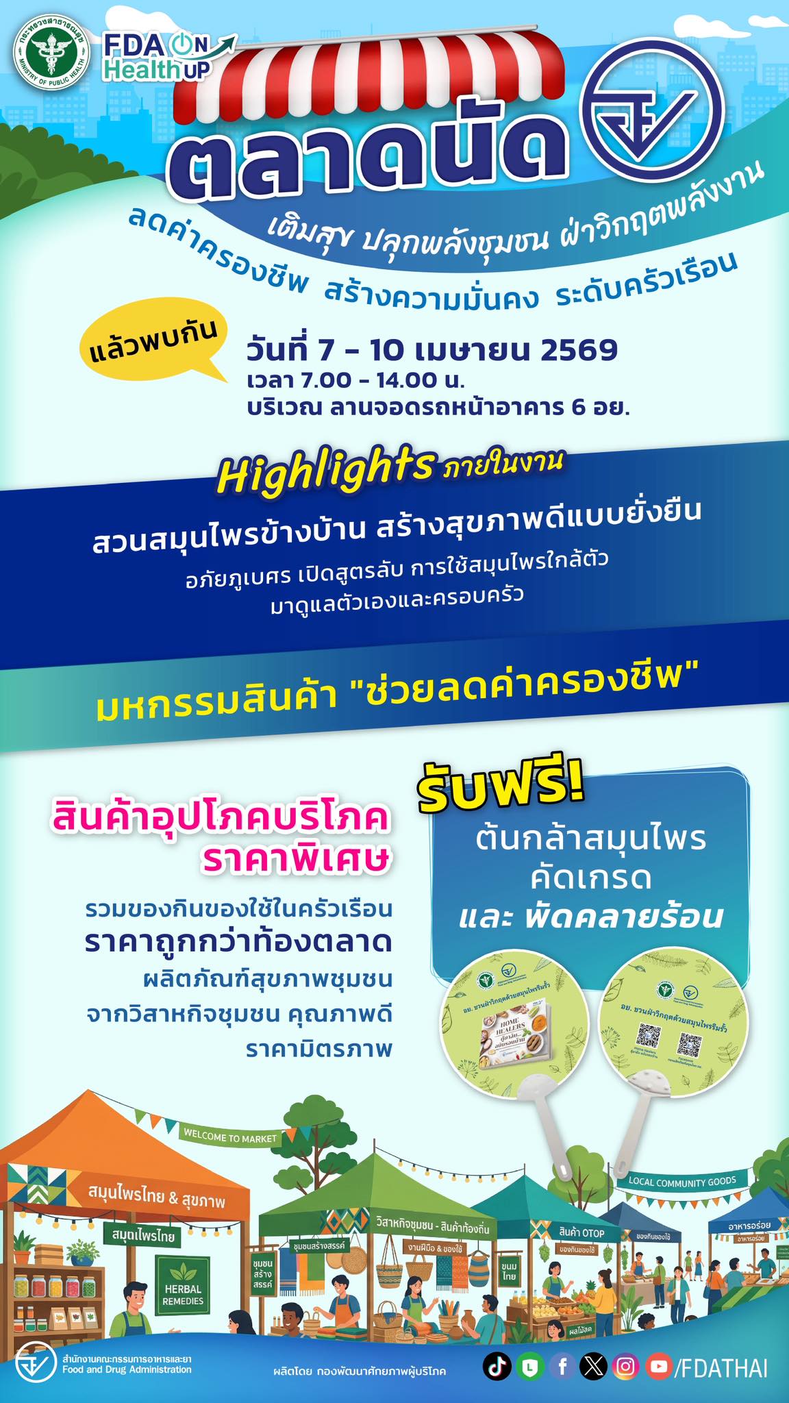 สำนักงานคณะกรรมการอาหารและยา (อย.) ชวนประชาชนเลือกซื้อสินค้าอุปโภคบริโภคคุณภาพดีในงาน “ตลาดนัด อย. เติมสุข ปลุกพลังชุมชน” ระหว่างวันที่ 7 - 10 เมษายน 2569 เวลา 07.00 - 14.00 น. ณ ลานจอดรถหน้าอาคาร 6 อย. เพื่อบรรเทาภาระค่าใช้จ่ายของประชาชนท่ามกลางภาวะค่าครองชีพสูง พร้อมส่งเสริมเศรษฐกิจฐานรากให้เติบโตอย่างเข้มแข็ง