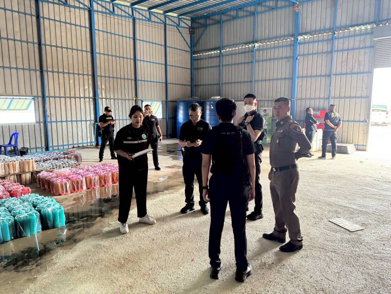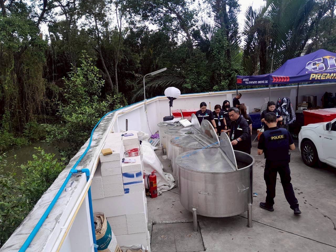 4. สถานที่ผลิต ผลิตภัณฑ์เครื่องดื่มสำเร็จรูปไม่ระบุยี่ห้อ ภายในอาคารในพื้นที่ ต.ในคลองบางปลากด อ. พระสมุทรเจดีย์ โดยเจ้าหน้าที่ตำรวจ กก.4 บก.ปคบ. ร่วมกับเจ้าหน้าที่สำนักงานคณะกรรมการอาหารและยา และเจ้าหน้าที่สำนักงานสาธารณสุขจังหวัดสมุทรปราการ นำหมายค้นของศาลจังหวัดพระประแดง เข้าตรวจค้นสถานที่ดังกล่าว พบนายจุมพล (สงวนนามสกุล) อายุ 34 ปี เป็นผู้นำตรวจค้น ผลการตรวจค้น สามารถตรวจยึดและอายัดของกลาง ได้แก่