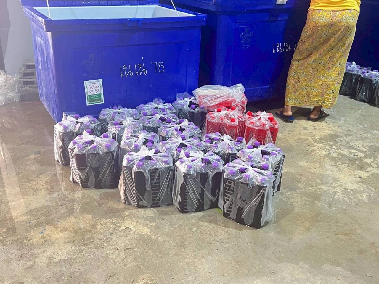 - ของเหลวใสบรรจุในถังพลาสติกสีน้ำเงิน จำนวน 2 ถัง