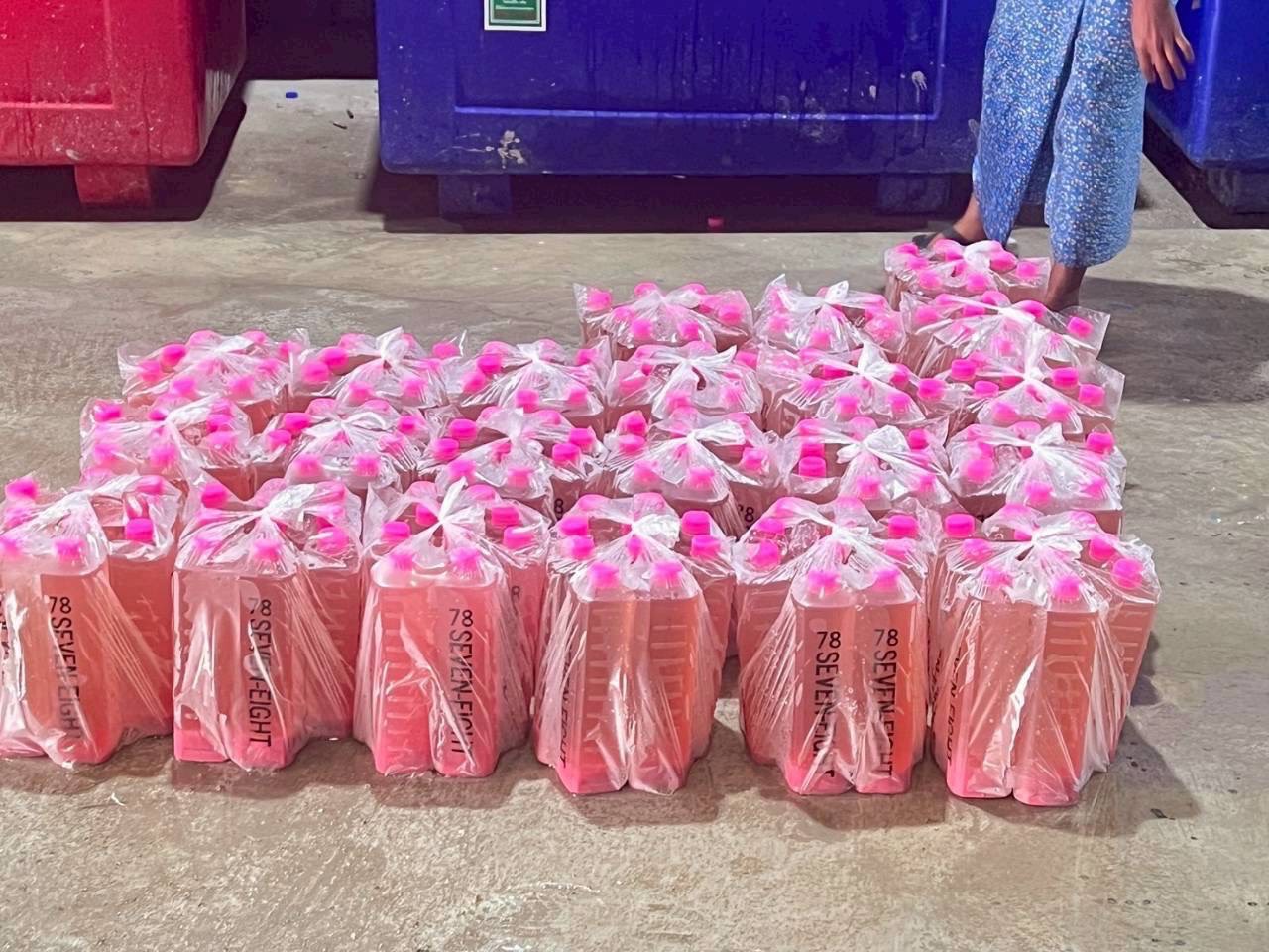 2.1 ผลิตภัณฑ์น้ำหวานรสผลไม้ ยี่ห้อ 78 (Seven-eight) ไม่มีเลขสารบบอาหาร สีต่าง ๆ กว่า 16 สี เช่น สีชมพู สีเขียว สีม่วง สีฟ้า จำนวน 7,800 ขวด